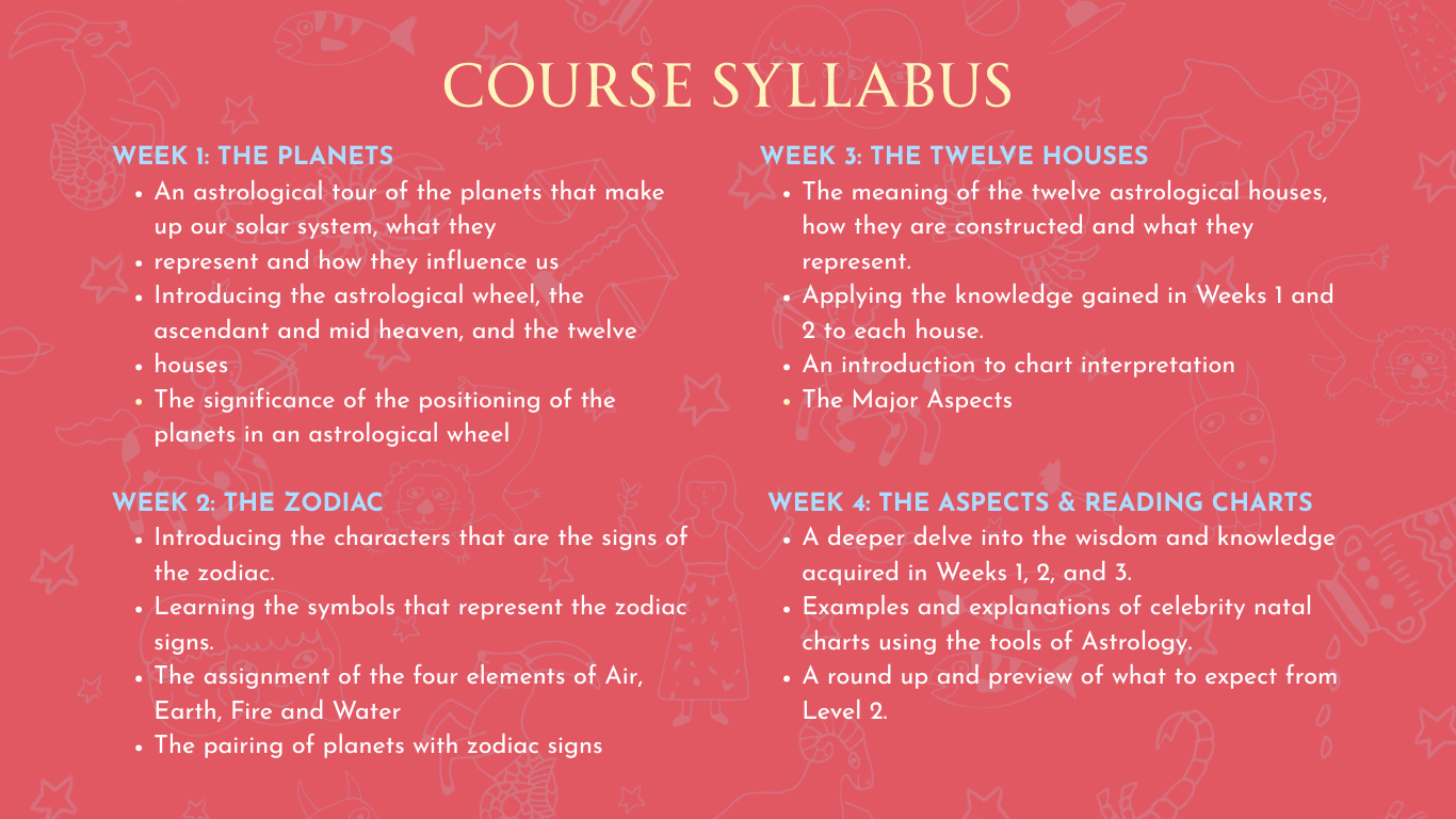 "I consider it a huge honor to teach this ancient wisdom to beginners. By the end of this course, you will have enough knowledge to use astrology in your daily life. Remember, this is powerful knowledge and should never be taken lightly. Astrology gives you the gift of ‘X-ray vision’—the ability to see the deeper wiring of yourself and others. That’s why I call astrology ‘the language of compassion.’ Once you understand how someone is designed, it brings peace."